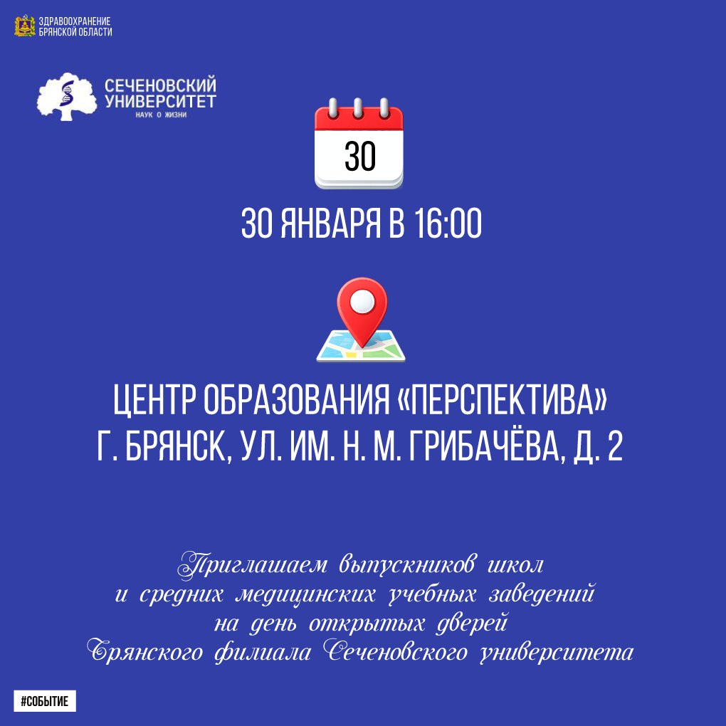 Приглашаем выпускников школ и средних медицинских учебных заведений на день открытых дверей Брянского филиала Сеченовского университета.