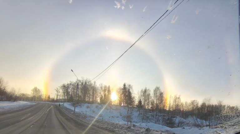 Редкое сочетание атмосферных эффектов превратило обычное зимнее утро в настоящее небесное шоу: на подъезде к городу очевидцы запечатлели яркое свечение вокруг Солнца и необычные световые отражения, которые возникают лишь при особых погодных условиях.