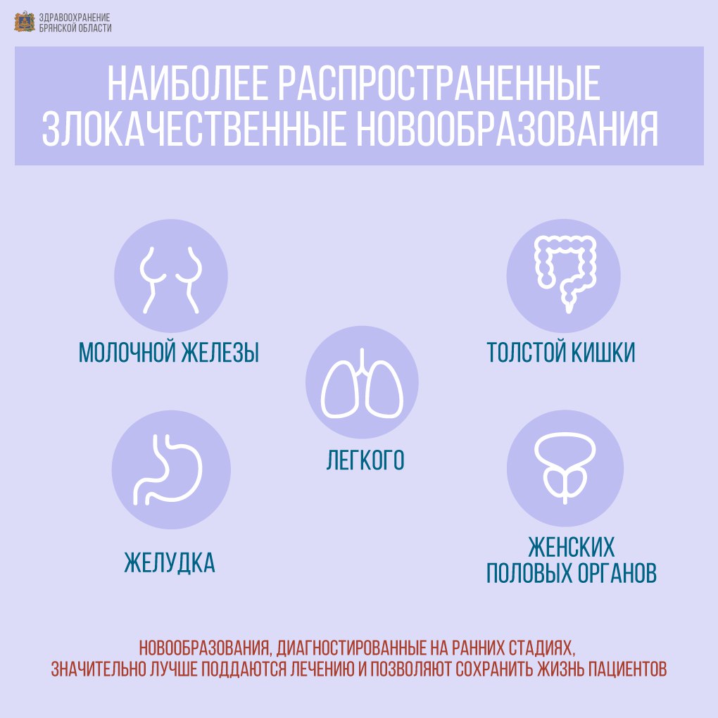 Наиболее распространёнными являются злокачественные новообразования кожи, молочной железы, толстой кишки, лёгкого, женских половых органов, предстательной железы и желудка.