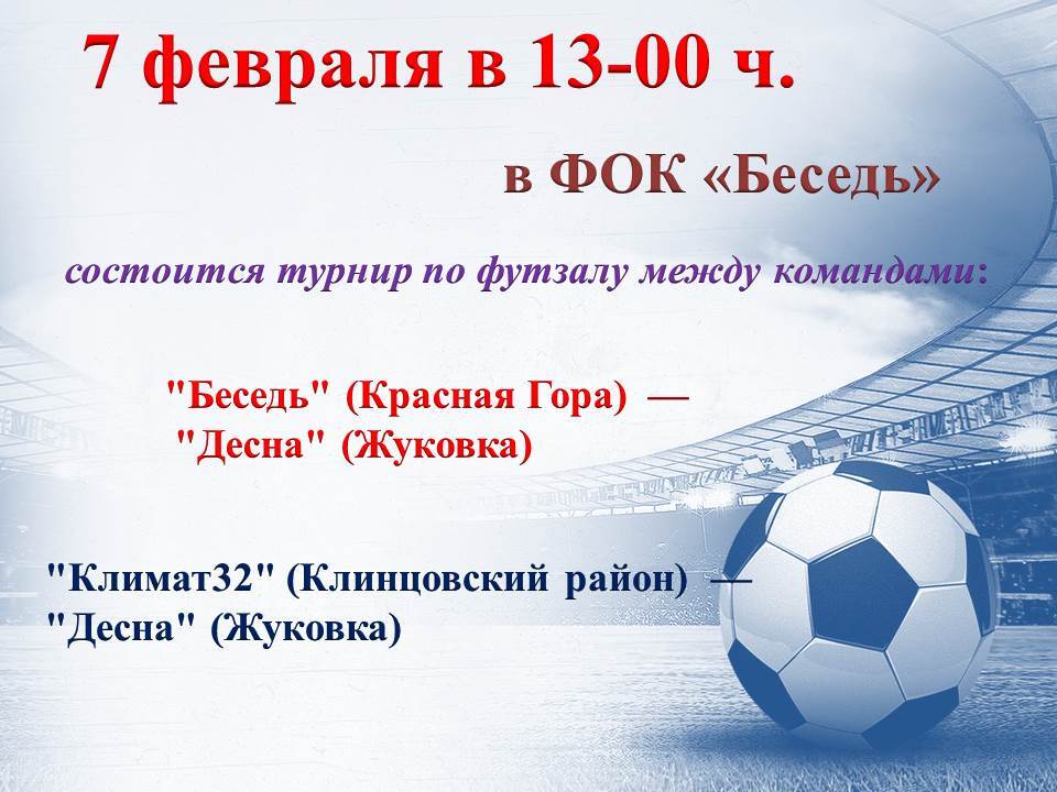 7 февраля 2026 года в физкультурно-оздоровительном комплексе «Беседь» состоится турнир по футзалу. Начало в 13-00 часов.