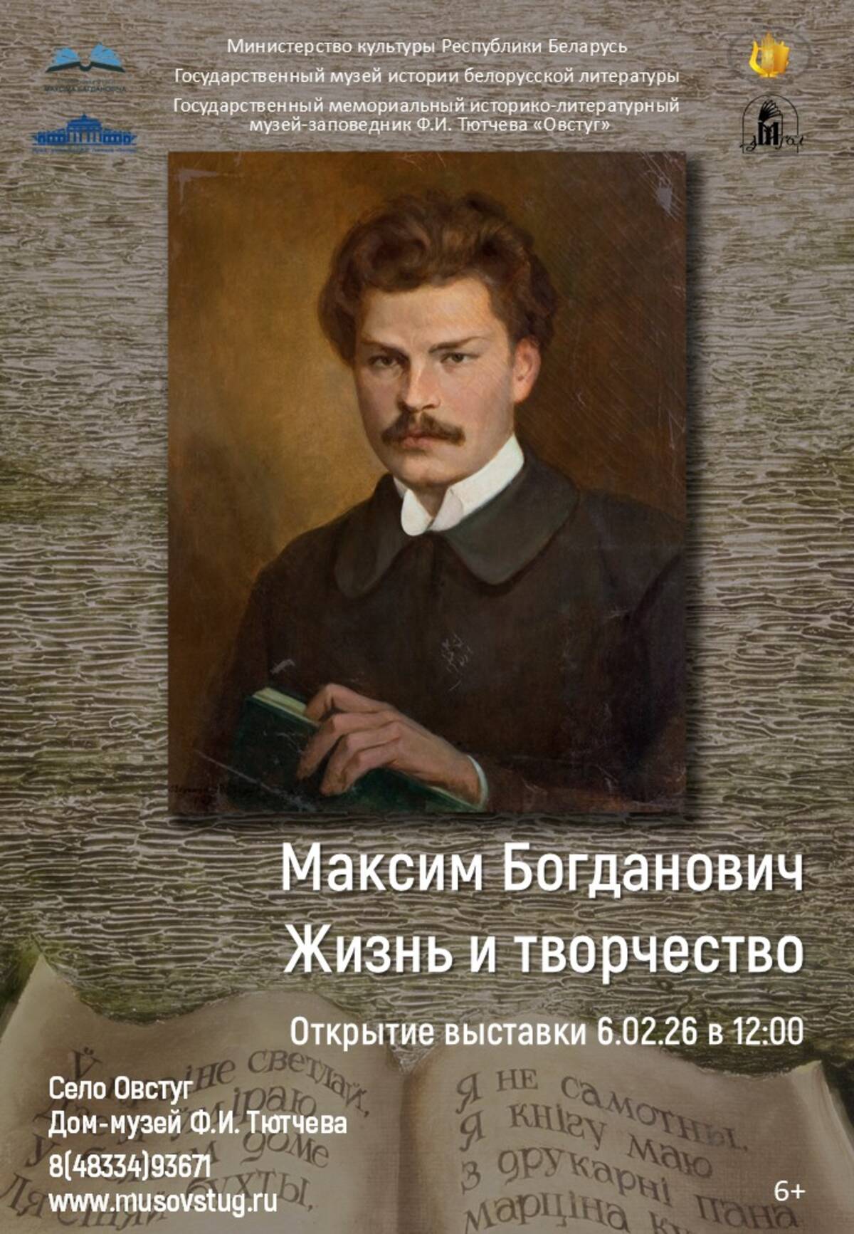 В пятницу, 6 февраля, в 12:00 в Государственном музее-заповеднике Ф.И. Тютчева «Овстуг» состоится торжественное открытие выставки «Максим Богданович. Жизнь и творчество». Экспозиция, подготовленная Государственным музеем истории белорусской литературы (г. Минск), познакомит жителей Брянской области с наследием классика белорусской словесности.