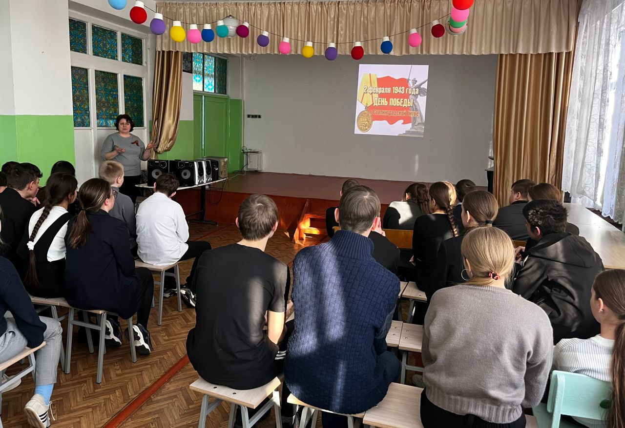 Ребята из 7 класса вместе с учителем истории Салун Надеждой Николаевной посвятили мероприятие Сталинградской битве — одному из ключевых сражений Великой Отечественной войны.