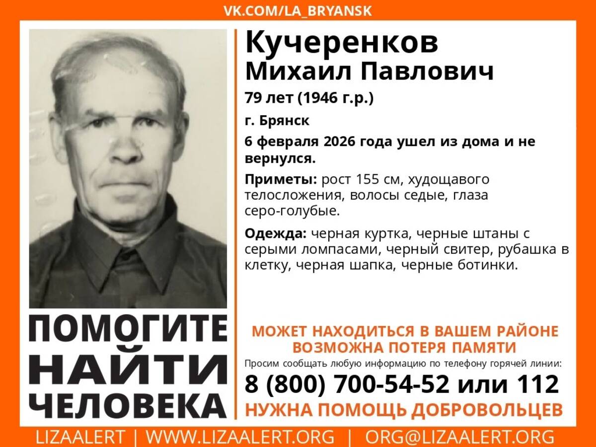 В Брянске без вести пропал 79-летний Михаил Кучеренков. С 6 февраля о его местонахождении ничего не известно.