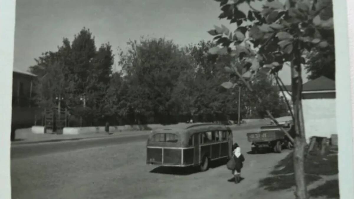 На черно-белой фотографии неизвестного автора зафиксирована городская панорама середины прошлого века. В центре композиции находится общественный транспорт — автобус и легковой автомобиль на фоне жилой застройки.