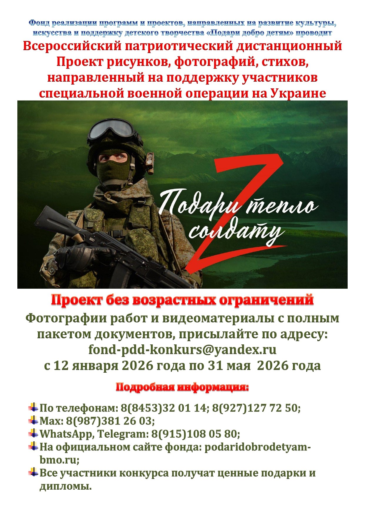 Фонд реализации программ и проектов, направленных на развитие культуры, искусства и поддержку детского творчества "Подари добро детям" проводит Всероссийский патриотический дистанционный Проект рисунков, фотографий и стихов направленный на поддержку участников специальной военной операции на Украине.