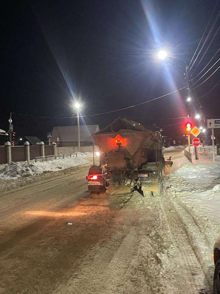В ночь на 9 февраля для уборки городских территорий были задействованы две комбинированные дорожные машины (КДМ) и трактор МТЗ «Беларус».