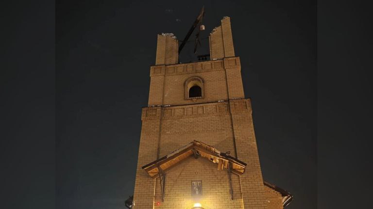 По его словам, одна из ракет попала в колокольню, также серьезно повреждена крыша трапезной части храма, выбиты окна и двери.