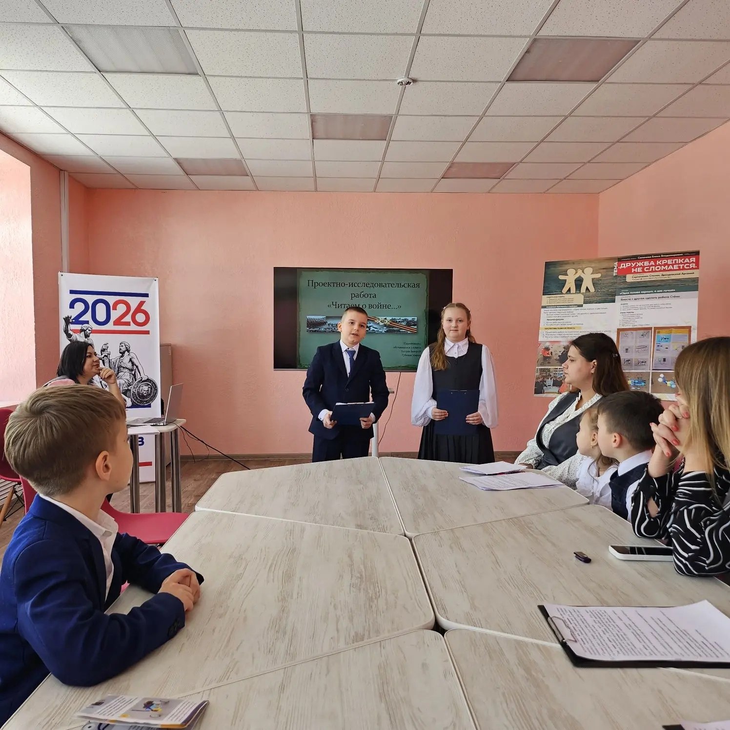 Наши юные исследователи, первоклассники Лебедько Алиса и Бондарев Илья продемонстрировали интерес к традициям, заложенных поколениями. Третьеклассники Губенок Мария и Холуев Валерий рассказали о писателях и поэтах Брянской земли, писавших о Великой Отечественной войне. Четвероклассники Буракова Анна и Осипенко Виктор определили, что на комфортность нашей городской среды влияет стилистическое разнообразие фонарей города. А второклассники Серпиченко Степан и Дроздовский Арсений доказали, что поиск решений и совместная деятельность, для создания чего-то нового, позволяет не только зародить дружеские отношения, но и укрепить дружбу в школьном коллективе.