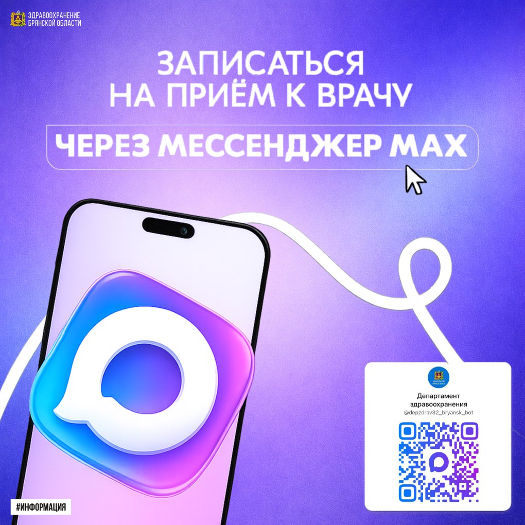 Для записи к врачу воспользуйтесь официальным ботом департамента здравоохранения Брянской области в приложении МАКС, доступного по ссылке: https://max.ru/depzdrav32_bryansk_bot. Для успешной записи необходимо авторизоваться с помощью своей учетной записи на портале «Госуслуги».