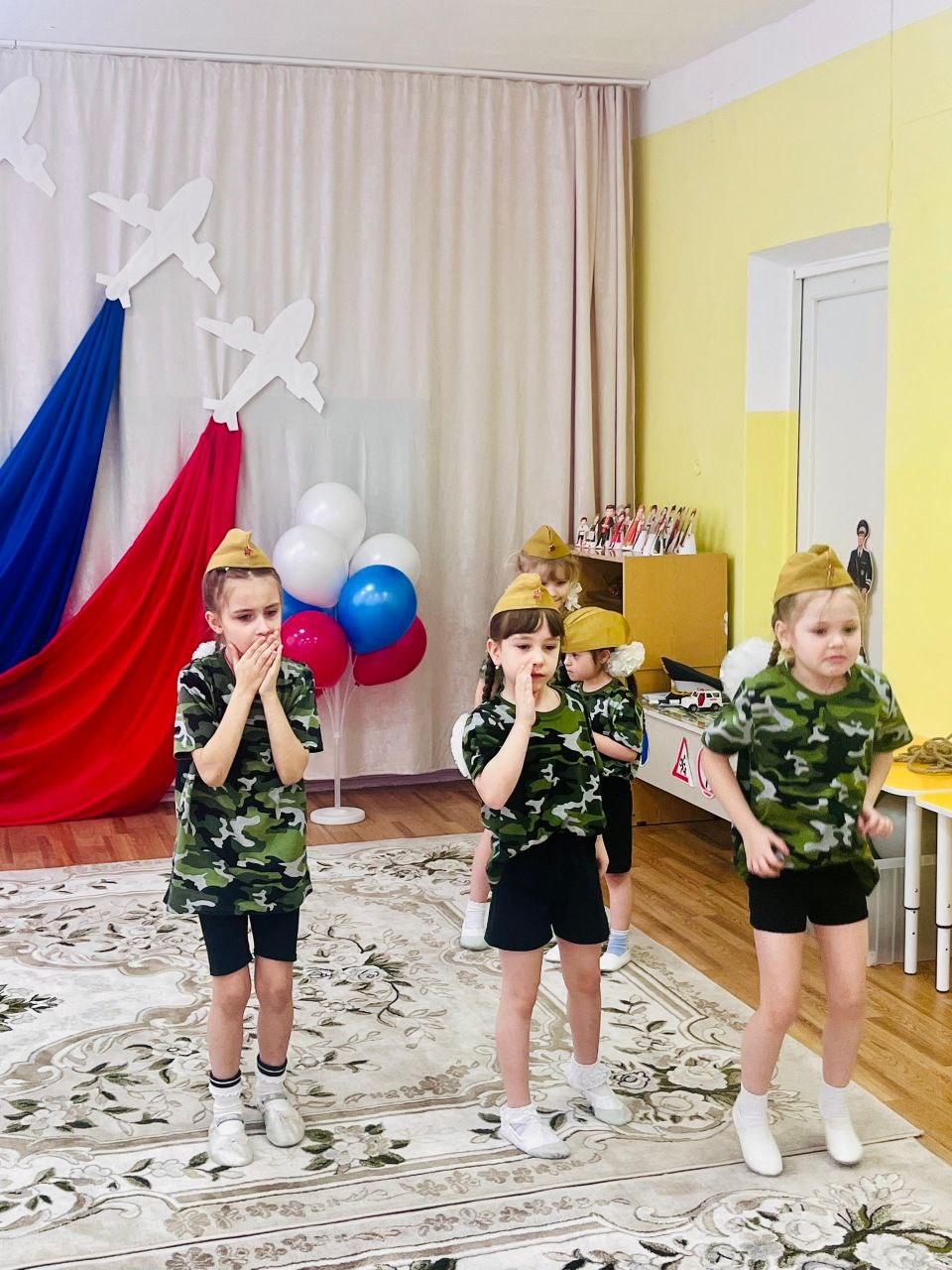 Ещё делали задорную зарядку, пели патриотические песни и рассказывали стихи для пап.