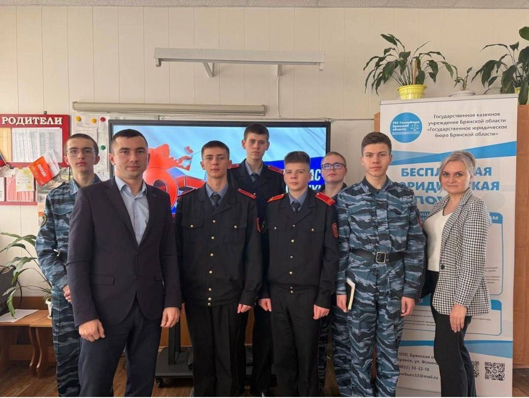 18 февраля 2026 года юрисконсульты ГКУ Госюрбюро Брянской области посетили Брянскую кадетскую школу имени Героя России В.И. Шкурного, где с их участием проведен информационный урок, касающийся грядущего праздника - Дня защитника Отечества.