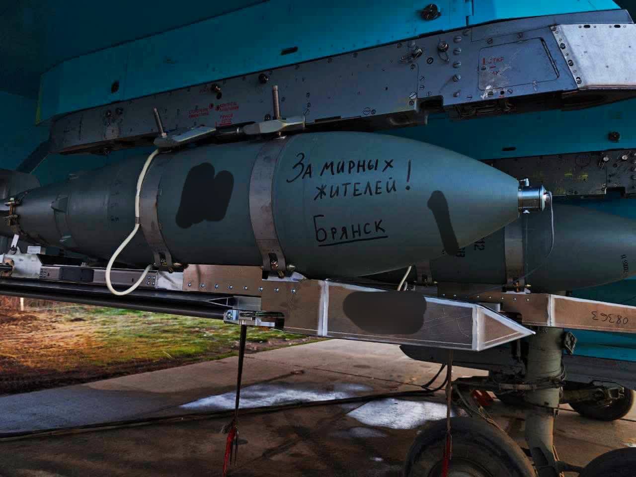 К бомбардировщику Су-34 подвесили ФАБ-500 УМПК с надписями «За каждого нашего - 1000 ваших» и «За мирных жителей! Брянск»Сфотографировался и экипаж самолета