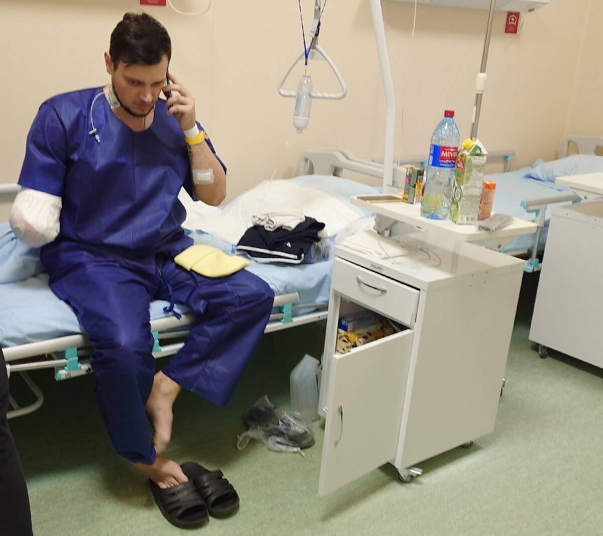 В момент трагедии Евгений находился на работе. В результате атаки он получил тяжелую травму - травматическую ампутацию правой руки.