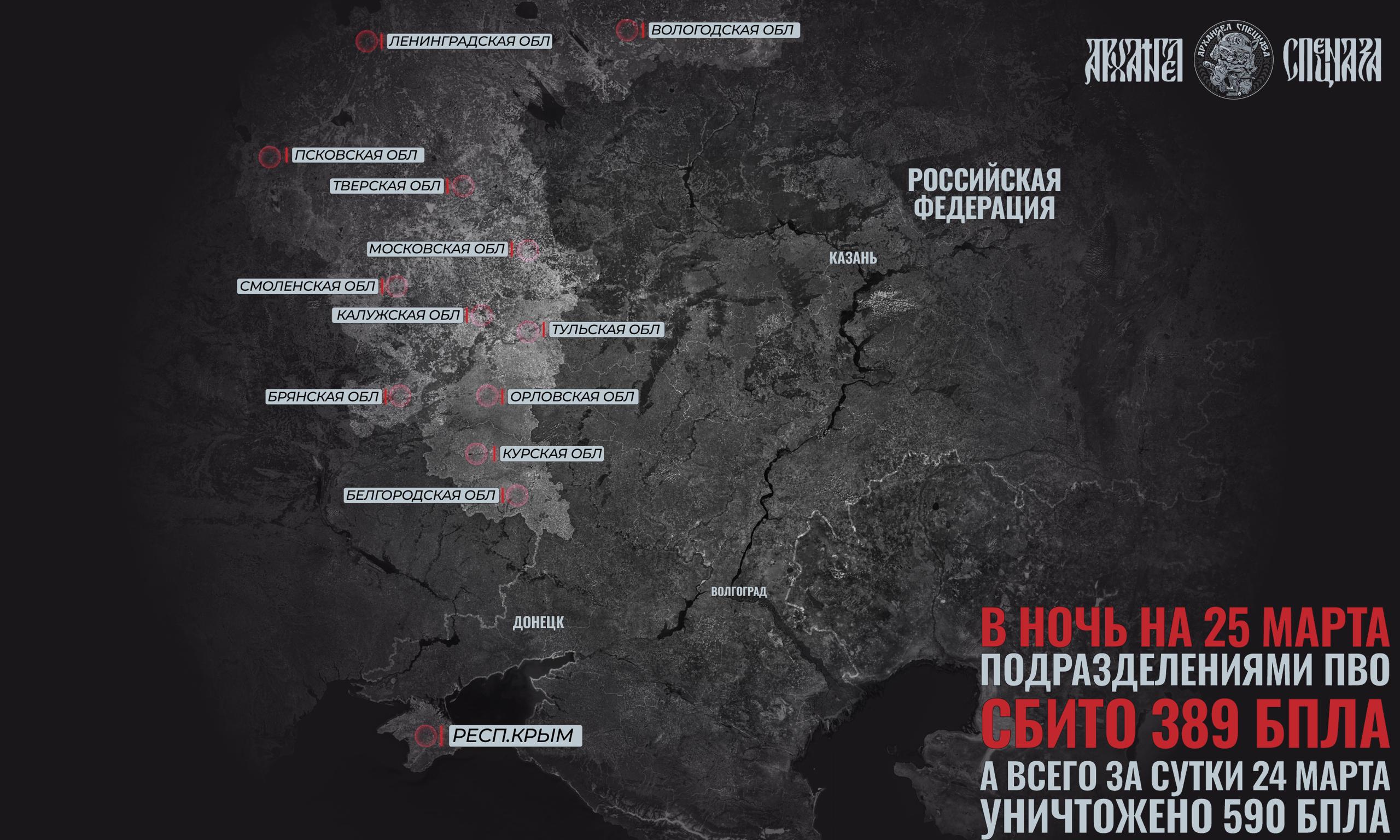 Если считать в общем за сутки с утра прошлого дня, то в общем российскими войсками было уничтожено 590 дронов в разных частях страны, преимущественно над Брянской областью.