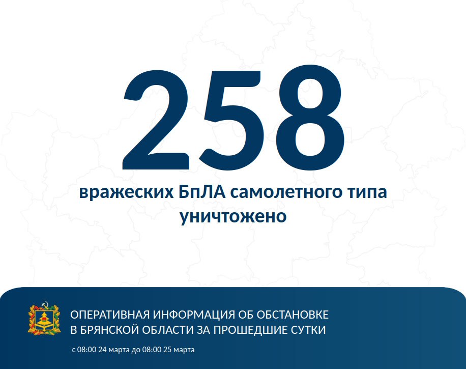 В Брянской области за прошедшие сутки – с 8.00 24 марта до восьми часов утра 25 марта сбили 258 украинских беспилотников самолётного типа, об этом в своём телеграм-канале сообщил губернатор Александр Богомаз.