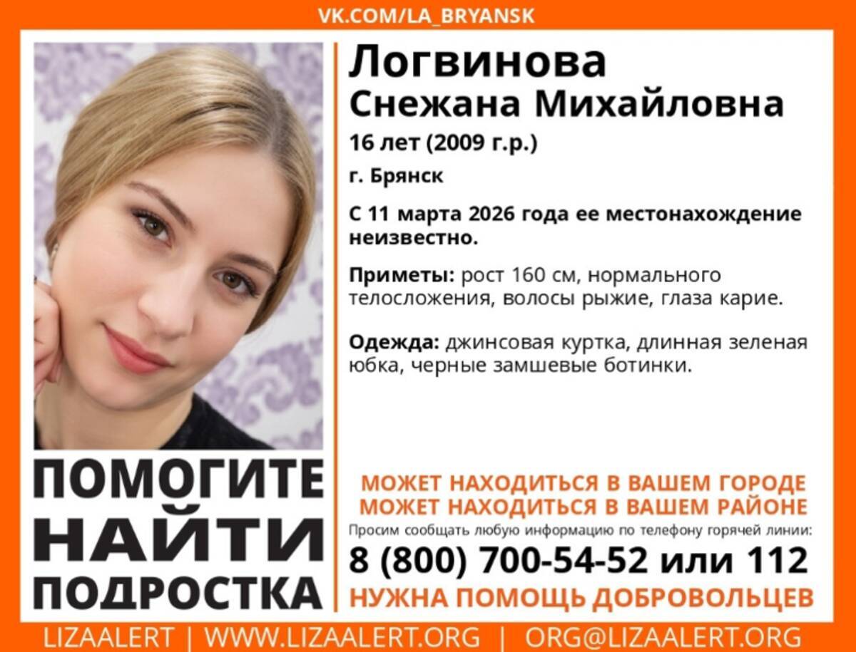 В Брянске завершились поиски 16?летней Снежаны Логвиновой, местонахождение которой оставалось неизвестным с 11 марта. Девушка найдена живой, сообщили в поисково?спасательном отряде «ЛизаАлерт».