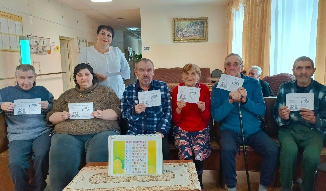 Медицинская сестра ГБСУ "Дом социального обслуживания Дятьковского района" провела для получателей социальных услуг познавательную беседу о принципах здорового питания. Елена Юркина рассказала о сбалансированном рационе, объяснила роль белков, жиров и углеводов, а также раздала участникам памятки с полезной информацией.