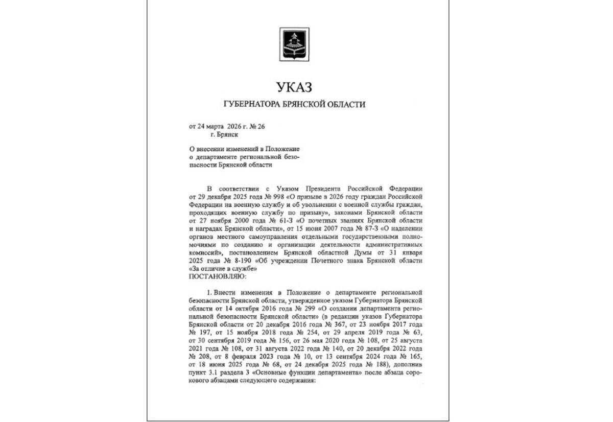 В Брянской области определён орган, ответственный за проведение мероприятий, связанных с призывом граждан на военную службу. Соответствующие изменения внесены указом губернатора в положение о департаменте региональной безопасности.