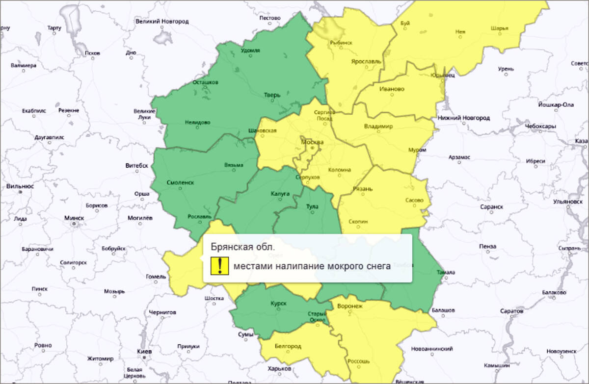 На данный момент в округе 12 субъектов выделены жёлтым цветом. Среди них - Орловская область. Там также ожидается налипание мокрого снега. Остальные соседи - «зелёные», а значит оповещения о погоде не требуются.