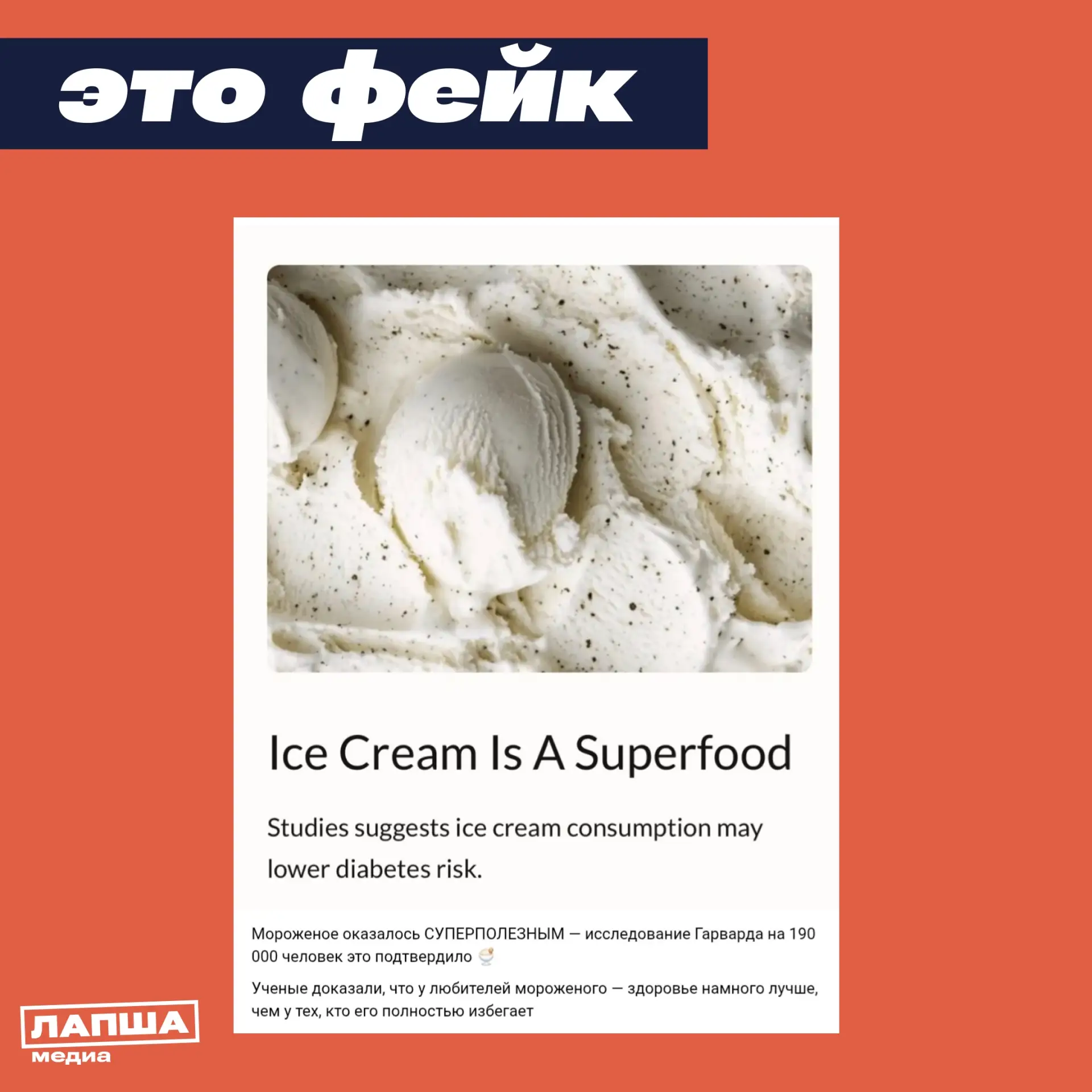 Исследование, на которое ссылаются в публикациях, действительно существует, но вышло ещё в 2018 году и было посвящено влиянию всех молочных продуктов на здоровье, а вовсе не исключительной пользе мороженого. В выводах учёных этот десерт оказался наименее опасным лишь потому, что люди едят его гораздо реже йогурта или сыра.