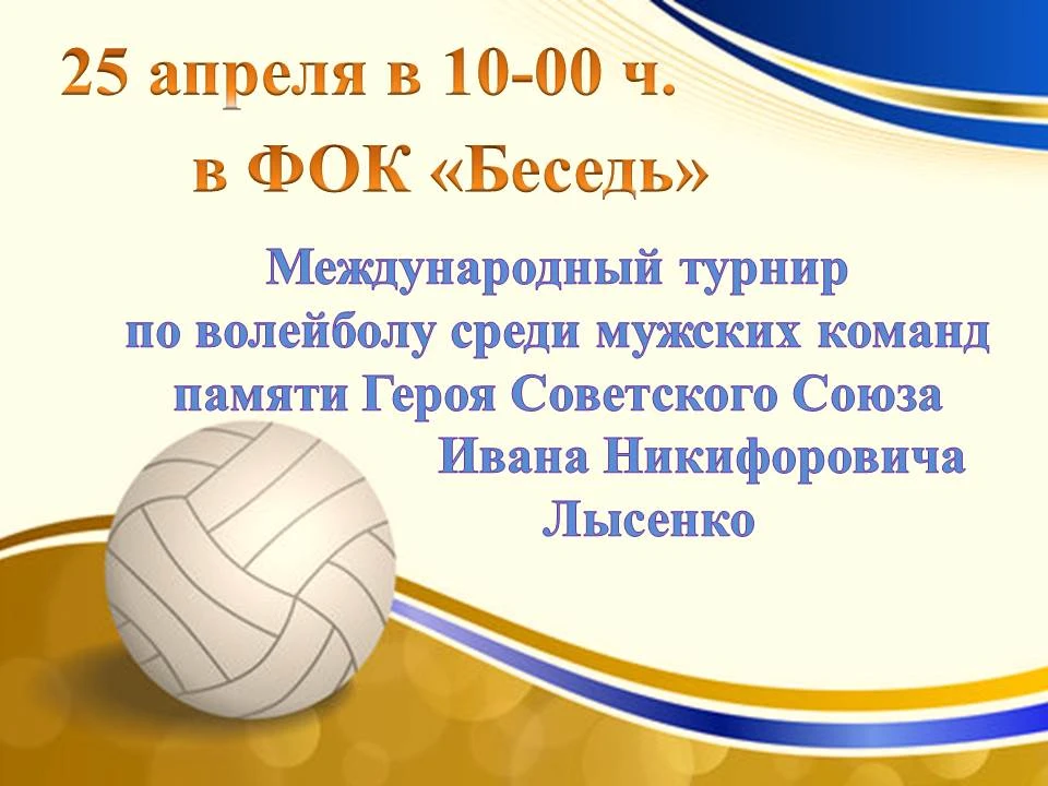 25 апреля 2026 года в физкультурно-оздоровительном комплексе «Беседь» пгт.Красная Гора состоится международный турнир по волейболу памяти Героя Советского Союза Лысенко Ивана Никифоровича.