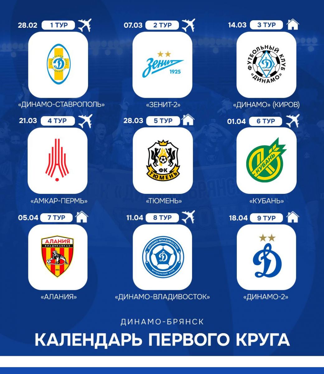 В соответствии с проектом календаря, ФК «Динамо-Брянск» проведет следующие матчи: 28 февраля 2026 года в гостях против «Динамо Ставрополь» (тур 1), 7 марта в гостях против «Зенита-2» из Санкт-Петербурга (тур 2).