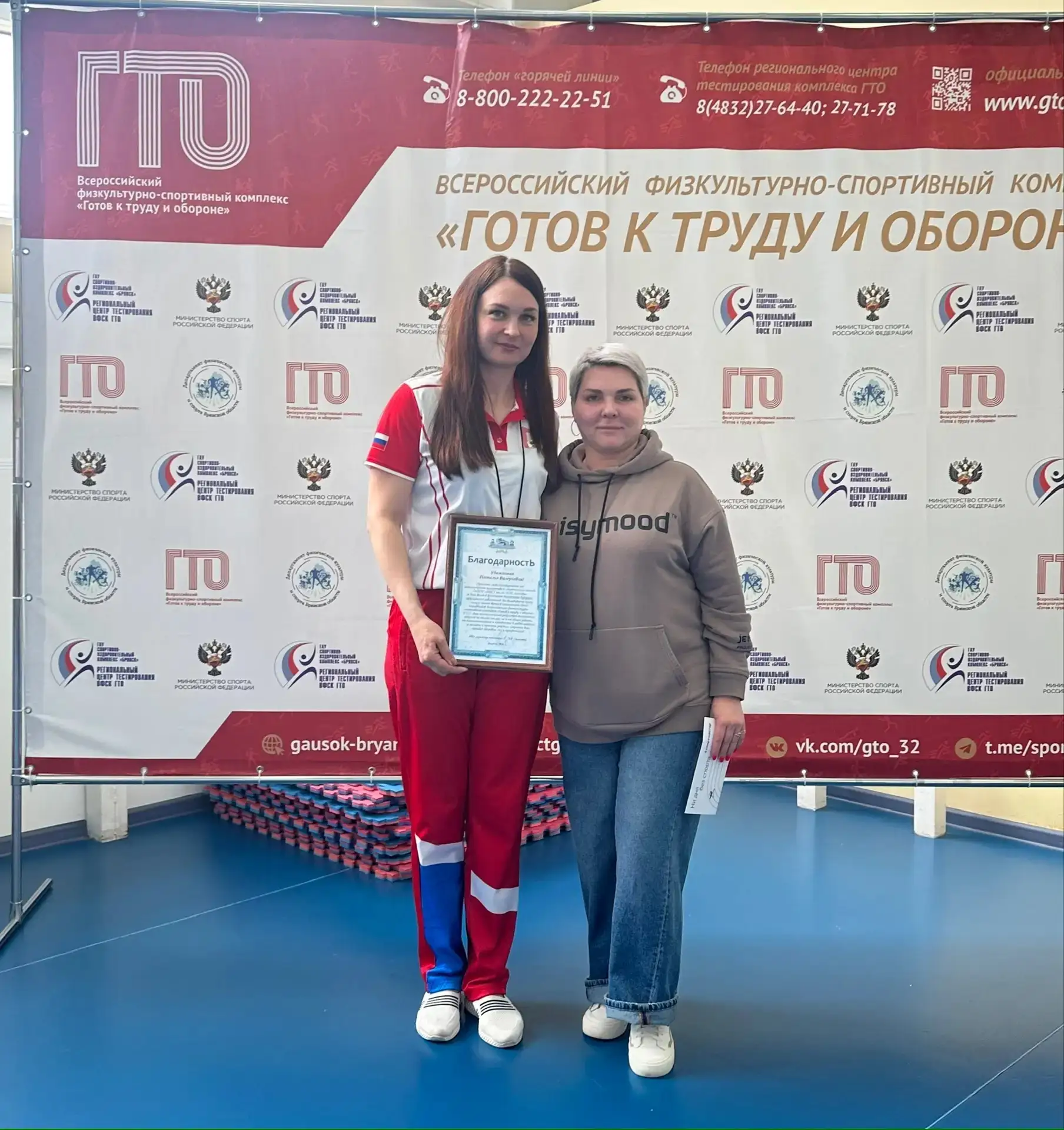 В торжественной обстановке Благодарность за вклад в физическое воспитание будущих медицинских работников от руководства колледжа была вручена главному судье Регионального центра тестирования ВФСК ГТО ГАУ «Спортивно-оздоровительный комплекс «Брянск» Наталье Валерьевне Куликовой.